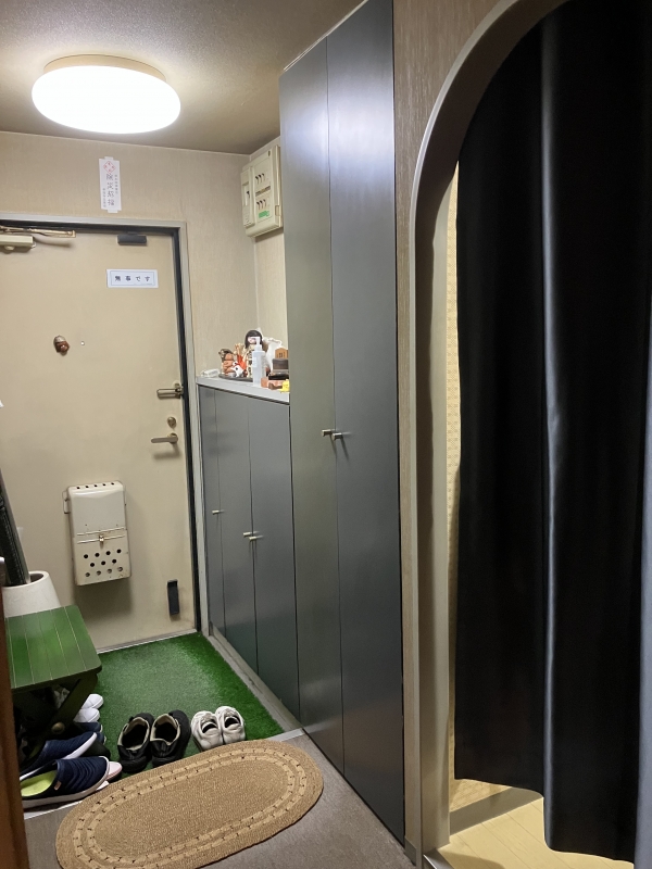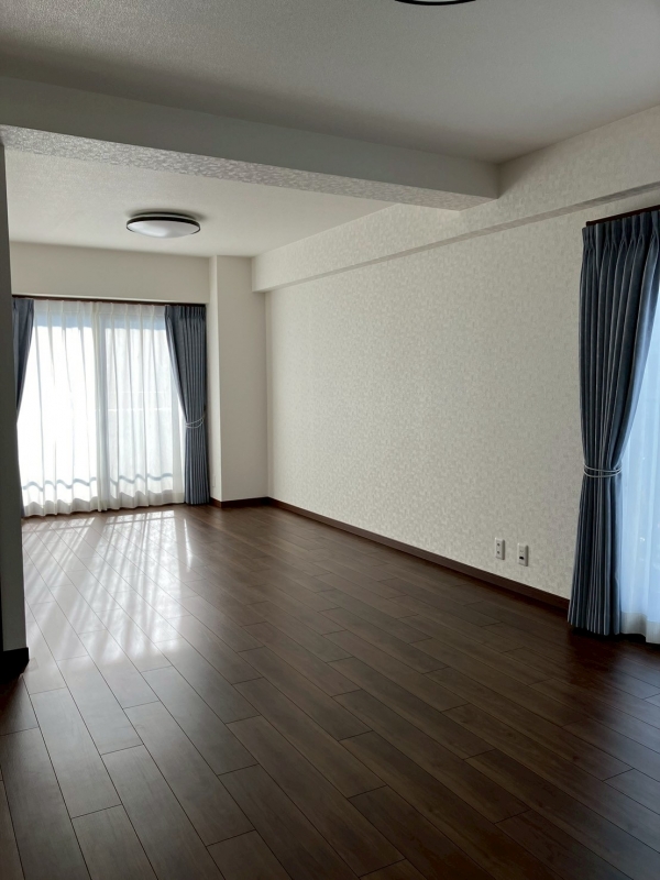 カーテンの色目がアクセントとなり、壁の白とのコントラストも映える落ち着いた空間に仕上がりました。